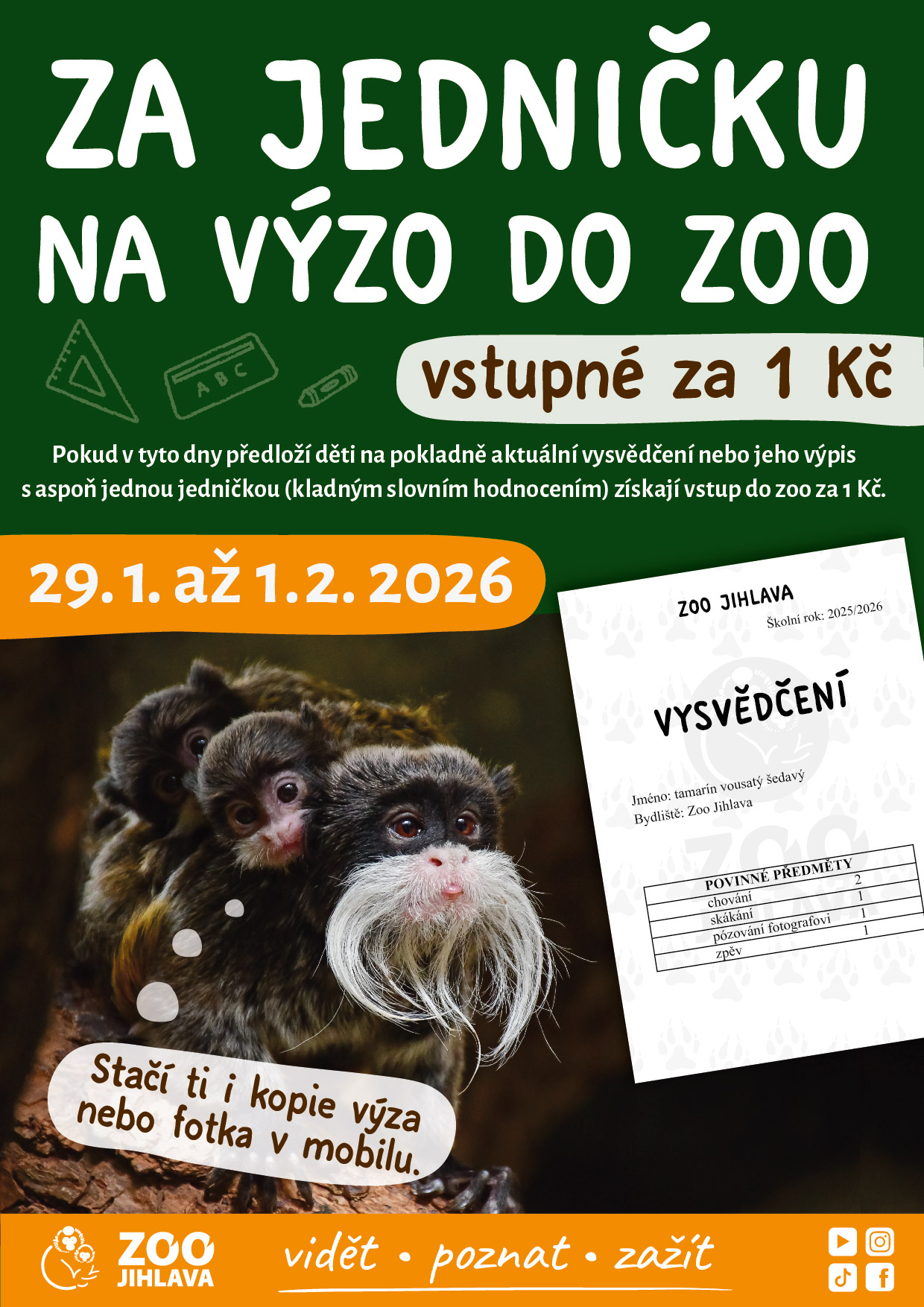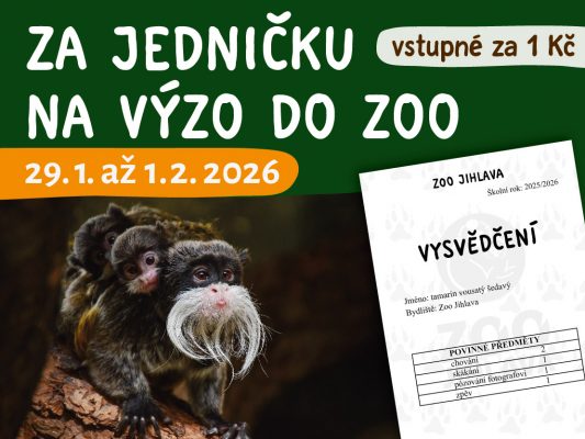 Přijďte na pokladnu zoo od 29. 1. do 1. 2. 2026 ukázat jedničku na vysvědčení a odměnou vám bude vstup jen za 1 Kč!