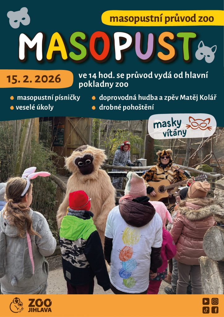 Čeká vás masopustní průvod zoo, který vyrazí od hlavní pokladny ke gibonům. Po cestě se můžete těšit na masopustní písničky, veselé úkoly pro malé i velké a doprovodnou hudbu a zpěv Matěje Koláře.