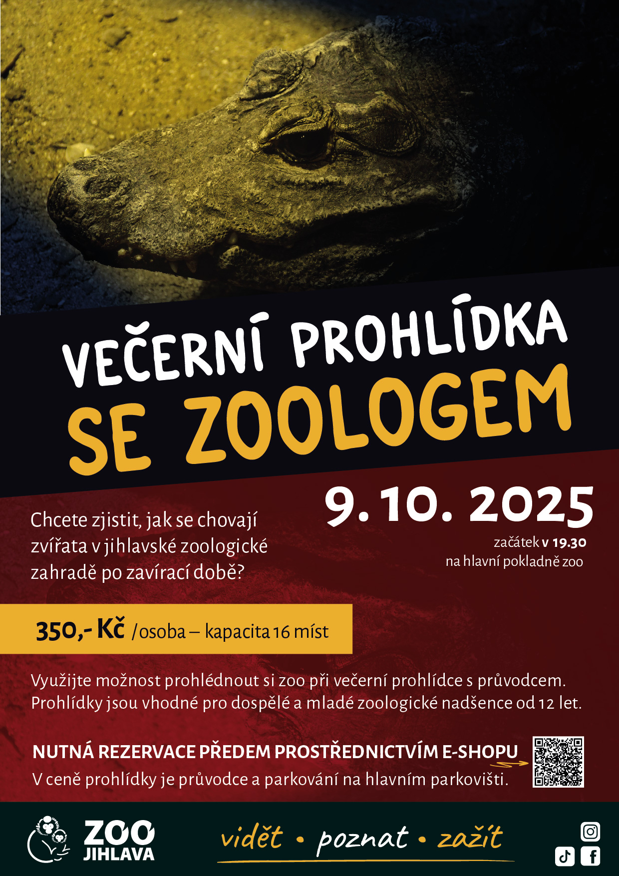 Chcete zjistit, jak se chovají zvířata v jihlavské zoologické zahradě po zavírací době? Využijte možnosti prohlédnout si ji při večerní prohlídce s průvodcem. Od března do října můžete zažít speciální večerní prohlídky se zoologem.