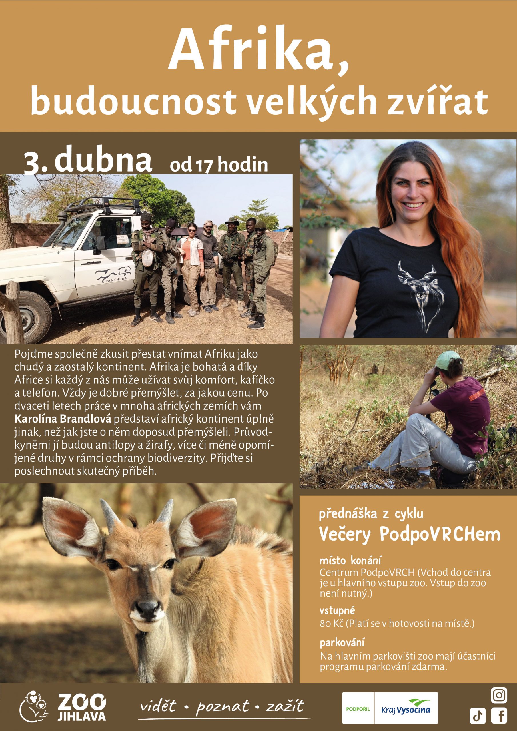 Pojďme společně zkusit přestat vnímat Afriku jako chudý a zaostalý kontinent. Afrika je bohatá a díky Africe si každý z nás může užívat svůj komfort, kafíčko a telefon. Vždy je dobré přemýšlet, za jakou cenu. Po dvaceti letech práce v mnoha afrických zemích vám Karolína Brandlová představí africký kontinent úplně jinak, než jak jste o něm doposud přemýšleli. Průvodkyněmi jí budou antilopy a žirafy, více či méně opomíjené druhy v rámci ochrany biodiverzity. Přijďte si poslechnout skutečný příběh.