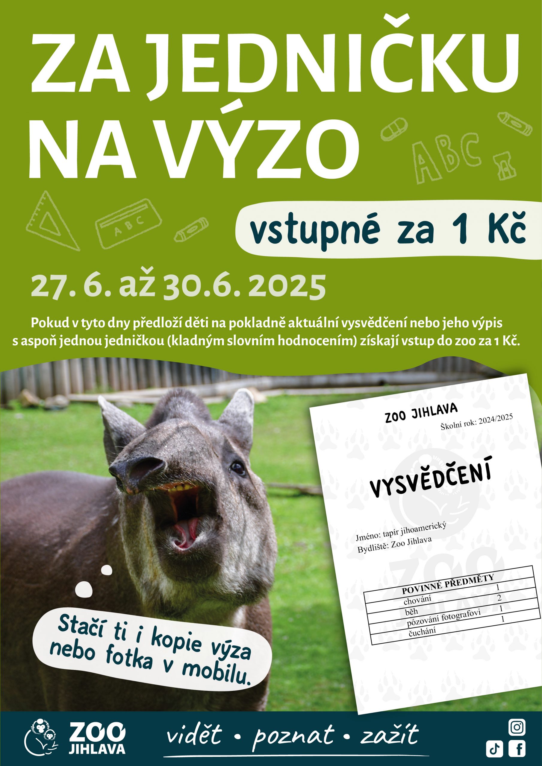 Pokud ve dnech 27. 6. 2025 až 30. 6. 2025 předloží děti na kterékoliv pokladně zoo aktuální vysvědčení nebo jeho výpis, s aspoň jednou jedničkou (kladným slovním hodnocením), získají vstup do zoo jen za 1 Kč. (vysvědčení může být naskenované v mobilním telefonu, nebo okopírované)