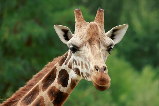 | Potrava | Okusuje větvičky a listí nejčastěji na akáciích, které omotává svým fialovým až 40 cm dlouhým jazykem. |